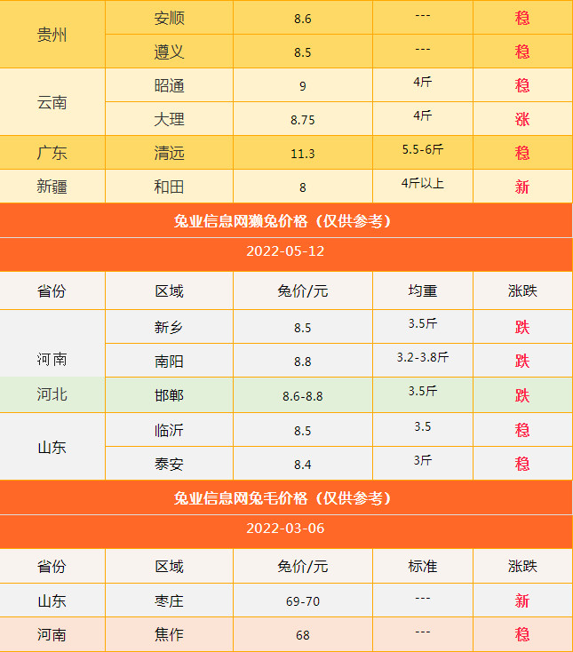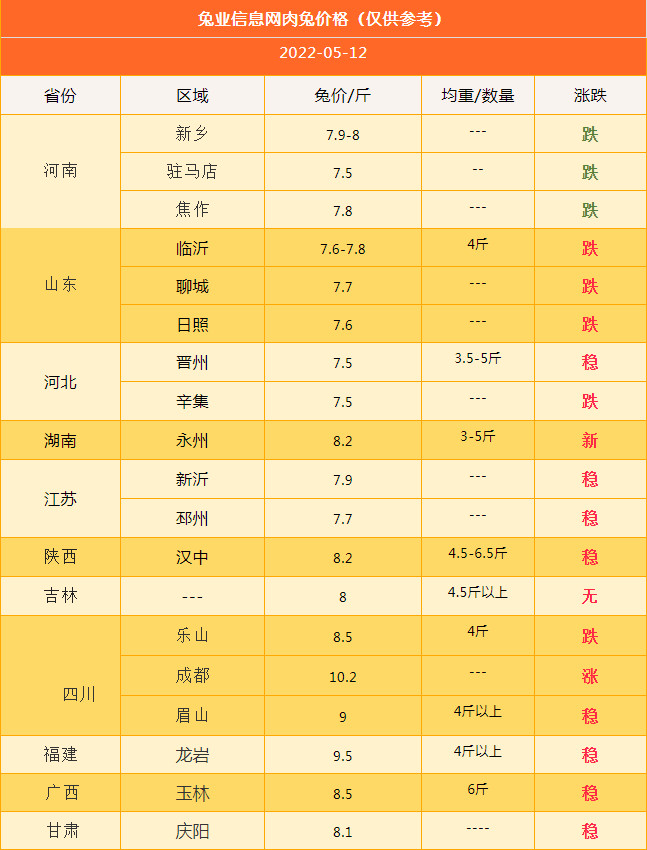 全國各地兔價(jià)行情快報(bào)?。?022年5.12)