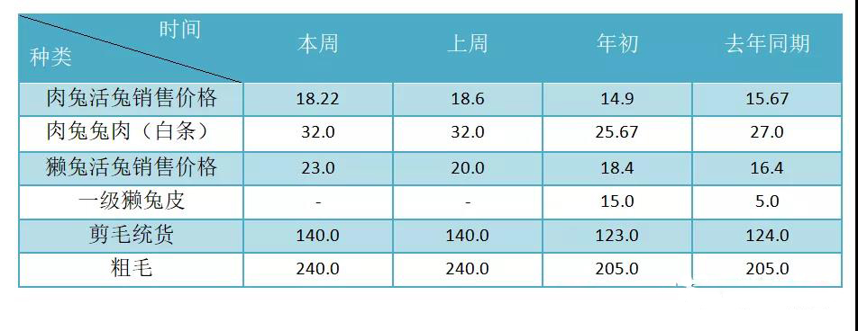 最新 兔業(yè)信息發(fā)布 最近一周肉兔活兔價(jià)格為18.22(元/公斤),與上周相比下降2%,與年初相比上升18% 最近一周肉兔活兔最高省份是福建,價(jià)格為20(元/公斤),最低省份是