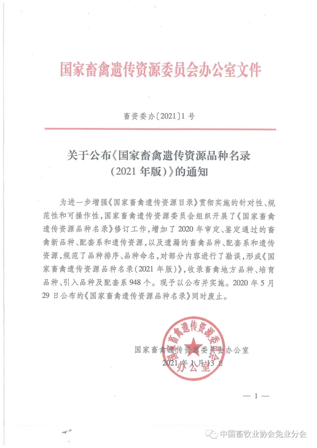 為進(jìn)一步增強(qiáng)《國(guó)家畜禽遺傳資源目錄》貫徹實(shí)施的針對(duì)性、規(guī)范性和可操作性,國(guó)家畜禽遺傳資源委員會(huì)組織開(kāi)展了《國(guó)家畜禽遺傳資源品種名錄》修訂工作,增加了2020年審定、鑒定通過(guò)的畜禽新品種、配套系和遺傳資源,以及遺漏的畜禽品種、配套系和遺傳資源,規(guī)范了品種排序、品種命名,對(duì)部分內(nèi)容進(jìn)行了勘誤,形成《國(guó)家畜禽遺傳資源品種名錄(2021年版)》,收錄畜禽地方品種、培育品種、引入品種及配套系948個(gè)?,F(xiàn)予以公布并實(shí)施。2020年5月29日公布的《國(guó)家畜禽遺傳資源品種名錄》同時(shí)廢止。