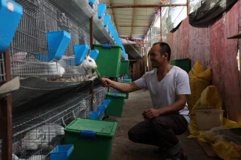 村民王佑平在給兔子喂食