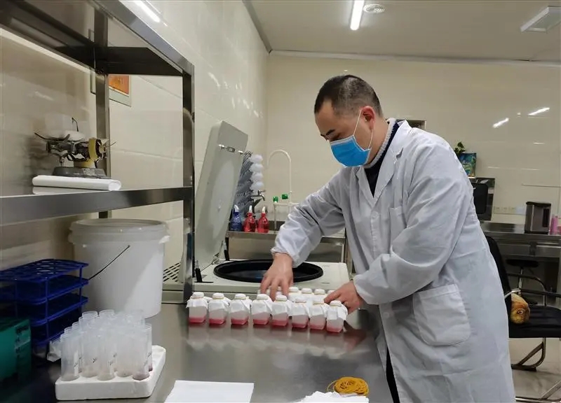 在金偉豐的陪同下,記者先是隔著玻璃參觀了機(jī)器人飼養(yǎng)場(chǎng),然后走進(jìn)實(shí)驗(yàn)室,只見(jiàn)一位工作人員正在儲(chǔ)存兔子血清。裝在小瓶子里的血清凍干后就送往以色列。