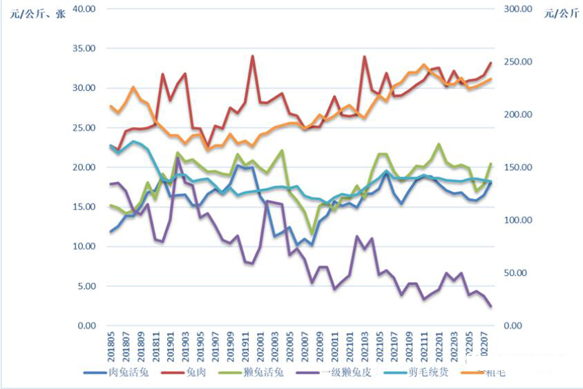 圖22018年5月—2022年7月兔及兔產(chǎn)品月度價(jià)格趨勢(shì)
