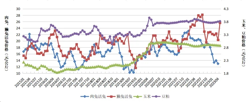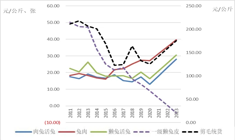 圖1 2011年—2023年兔及兔產(chǎn)品平均價格走勢 (右坐標(biāo)為兔毛價格)