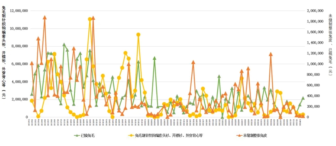 2024年1月份整張兔皮進口額為143.09萬元,較上月上升19.20%;兔毛制針織鉤編套頭衫、開襟衫、外穿背心等進口額為0.36萬元,較上月下降20.17%(見圖7)。