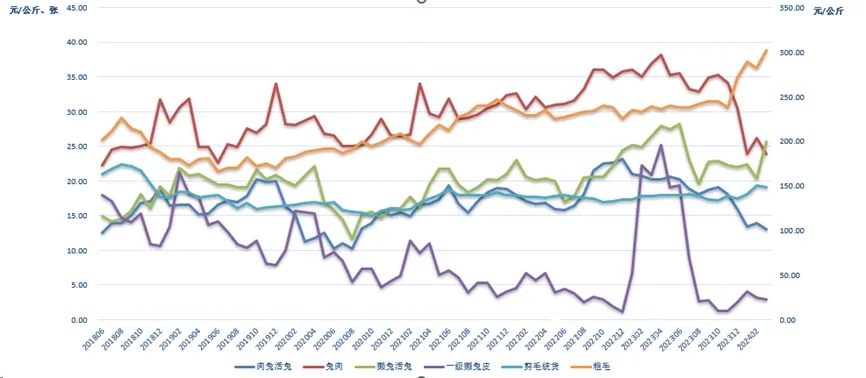圖2 2018年6月-2024年2月兔及兔產(chǎn)品價格走勢(右坐標(biāo)為兔毛價格)