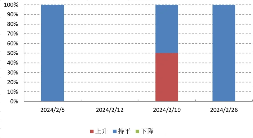 通過對中間環(huán)節(jié)集散地的價格進行監(jiān)測,與2024年1月份相比,2024年2月份中有三周的銷售情況基本持平,一周的銷售情況為50%持平,50%上升。(見圖3)。