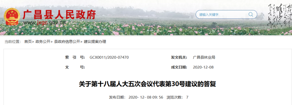 12月8日,廣昌縣林業(yè)局通過廣昌縣人民政府官網(wǎng)公布了《關(guān)于第十八屆人大五次會議代表第30號建議的答復(fù)》。