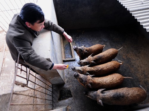 11月26日,工作人員在給野豬喂食。從2004年起,山西平陸縣鈺誠都特種野豬馴養(yǎng)有限公司采用“公司+基地+農戶”的模式,帶動當?shù)?80多農戶飼養(yǎng)特種野豬2.2萬余頭,累計增收660余萬元。這種特種野豬食量少,肉質好,是通過認證的“有機食品”。