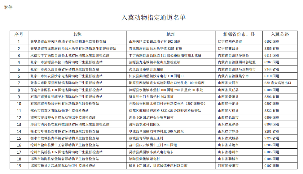 一、省政府設立秦皇島市山海關區(qū)邊墻子省際動物衛(wèi)生監(jiān)督檢查站等19個入冀動物指定通道(詳見附件),同時撤銷原49個公路動物防疫監(jiān)督站(點)。