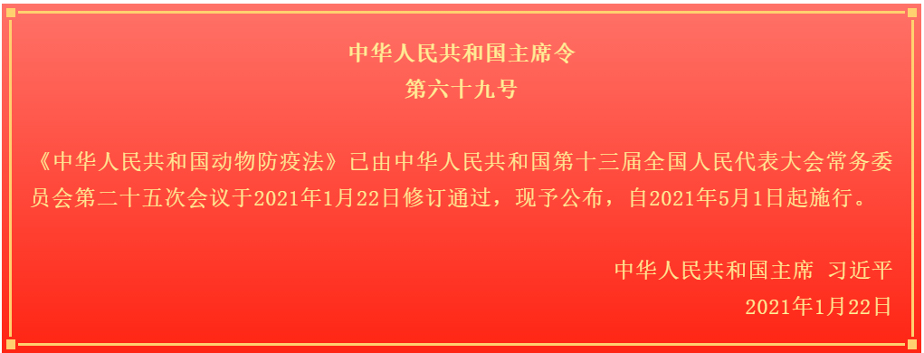 2021年1月22日,十三屆全國人大常委會第二十五次會議審議通過了《中華人民共和國動物防疫》修訂草案,隨即以《中華人民共和國第69號主席令》形式公布,自5月1日起實施。這是
