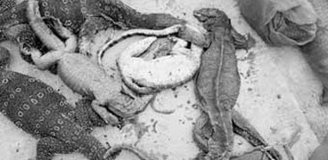 圖為已經(jīng)死去的圓鼻巨蜥 本報記者 蔡巖紅 5776只奄奄一息的巨蜥被裝在一個個藍(lán)色和黃色的編織袋中,260只馬來西亞閉殼龜和370只亞洲巨龜被牢牢地封在木箱中,而1170