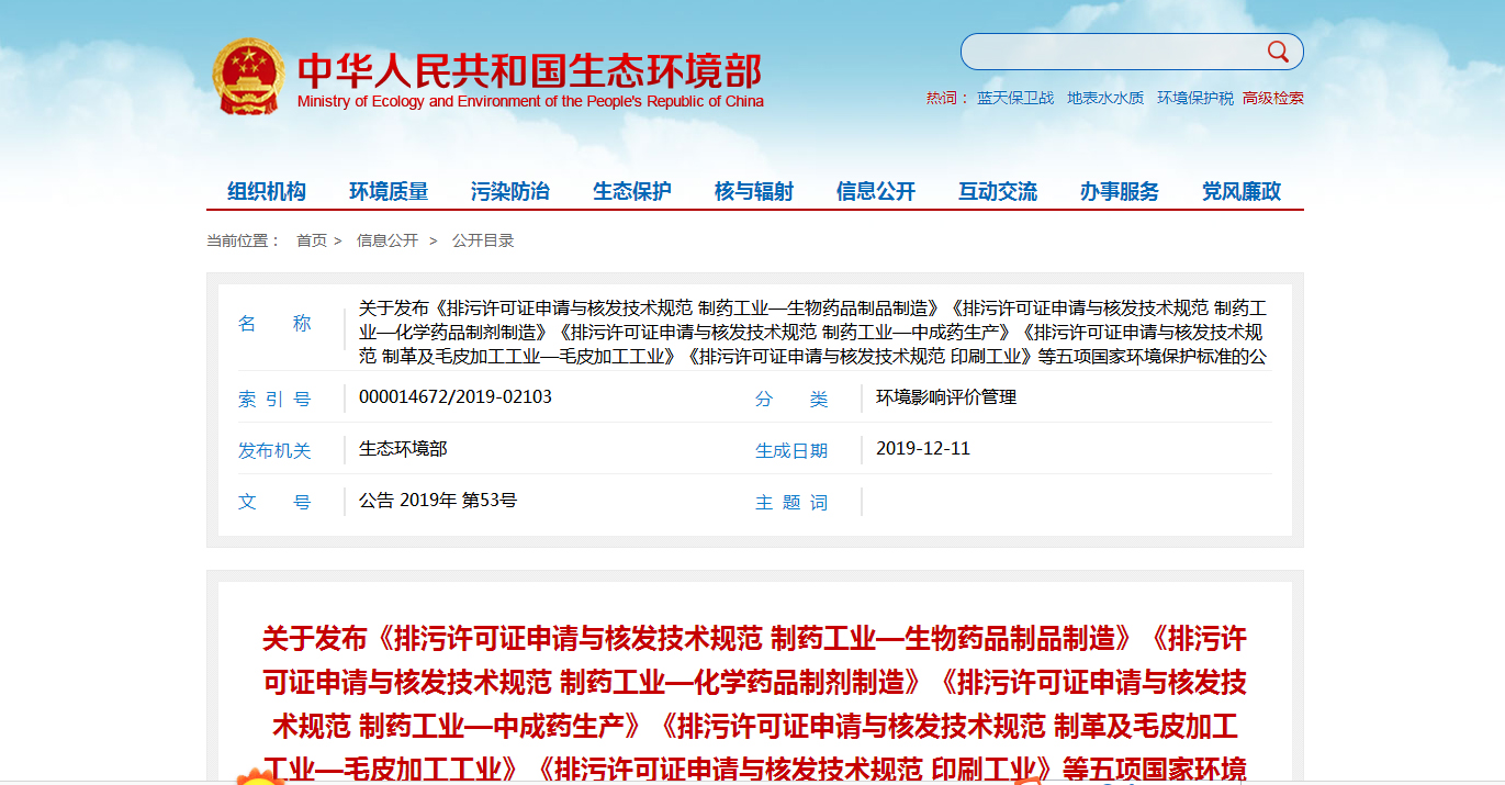 關(guān)于發(fā)布《排污許可證申請與核發(fā)技術(shù)規(guī)范 制藥工業(yè)—生物藥品制品制造》《排污許可證申請與核發(fā)技術(shù)規(guī)范 制藥工業(yè)—化學(xué)藥品制劑制造》《排污許可證申請與