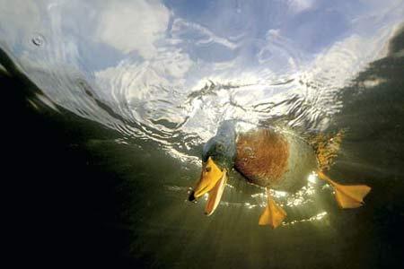新浪科技訊 北京時間2月18日消息,據(jù)英國《每日郵報》報道,英國的一名攝影師最近拍到一張令人驚奇的照片:一只綠頭鴨伸著黃色的長喙,雙眼緊盯著水下的目標,潛入寒冷的北威爾士湖捕獵食物。