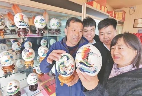 趙金柱(左一)在展示用鴕鳥蛋雕刻的工藝品。
