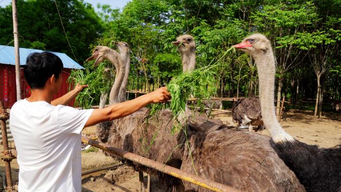 “鴕鳥全身都是寶,不僅肉、蛋有很高的食用價值,其皮毛還能制成工藝品。”鴕鳥養(yǎng)殖基地負責人白文勝一邊攪拌飼料,一邊介紹,“鴕鳥生長快、易飼養(yǎng),繁殖和抗病能力強,前提是場地建設(shè)、養(yǎng)殖、孵化等每一個環(huán)節(jié)都不能出錯。”