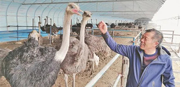 趙金柱(左一)在展示用鴕鳥蛋雕刻的工藝品?! ≮w金柱(左一)在展示用鴕鳥蛋雕刻的工藝品 趙金柱和他養(yǎng)殖的鴕鳥 近日,春雨滋潤(rùn)著寒地黑土,走進(jìn)黑龍江省雞西市虎林市慶