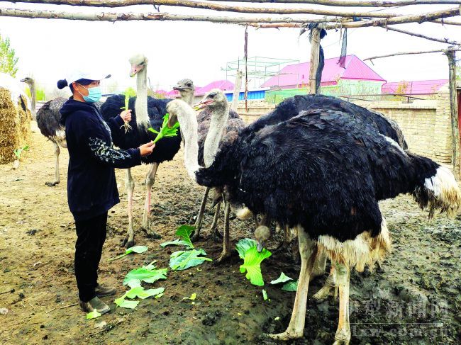 “老話說,家有萬貫,帶毛的不算,可在我這兒,帶毛的都是寶貝。”今年53歲的伊寧市南岸新區(qū)伊興社區(qū)居民馬開買談起鴕鳥養(yǎng)殖,話匣子就收不住了。圖為馬開買的家人正在給