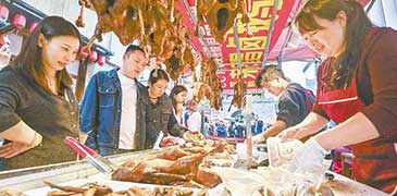 4月24日,榮昌區(qū)夏布小鎮(zhèn),榮昌鹵鵝的人氣爆棚,眾多游客前來購買。記者 鄭宇 攝/視覺重慶 5月4日,四川游客李利拎著兩盒“榮昌鹵鵝”,準(zhǔn)備坐高鐵回家。她的手機里