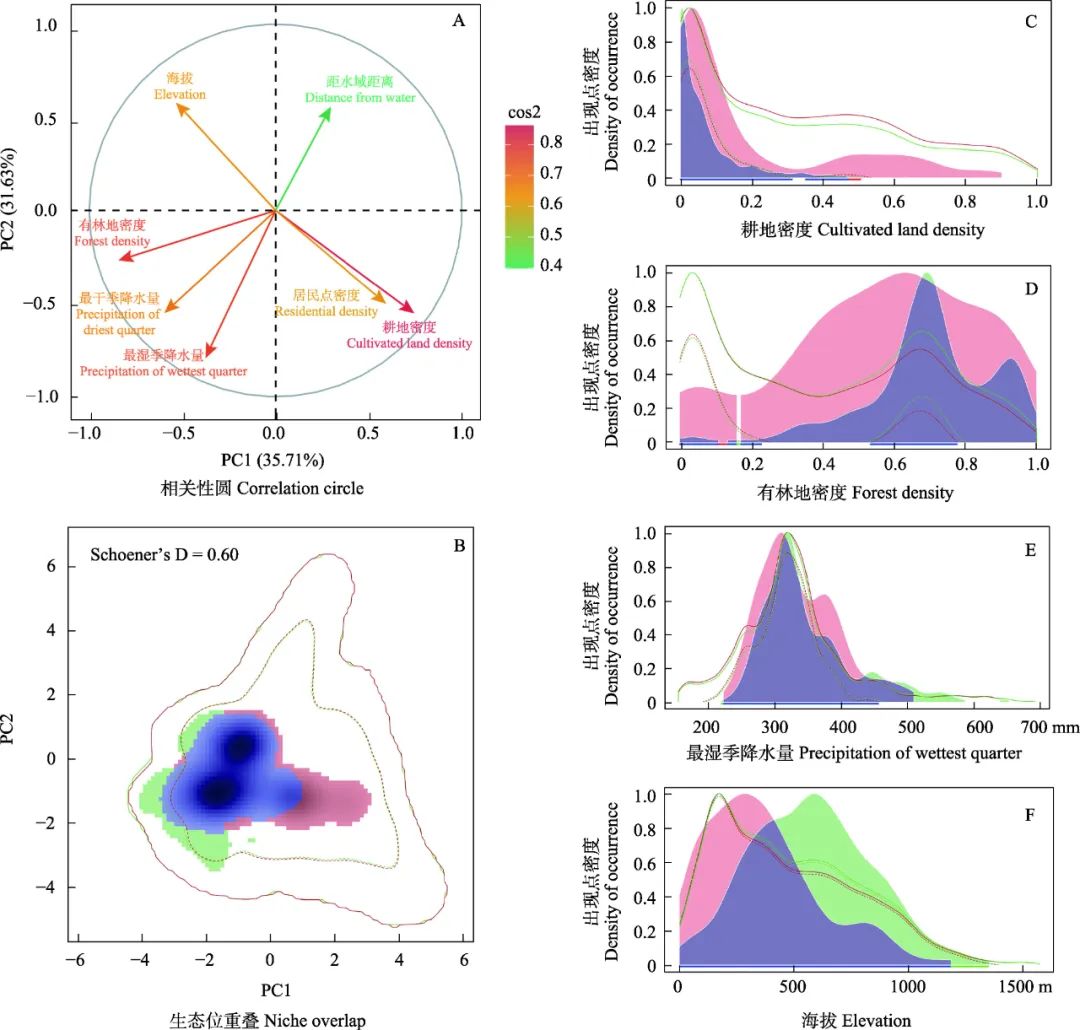 (2)水貂和水獺生態(tài)位存在高度重疊,Schoener’s D值達(dá)到0.60。單因子生態(tài)位分析結(jié)果表明,水獺比水貂對(duì)耕地密度更加敏感,集中分布在低耕地密度區(qū);水獺和水貂均傾向選擇有林地密度較高的區(qū)域,但水貂在有林地密度的選擇上更加平滑,對(duì)森林的依賴程度比水獺低;水貂相比水獺更傾向選擇降水量低的區(qū)域;水獺比水貂更傾向選擇高海拔的棲息地。