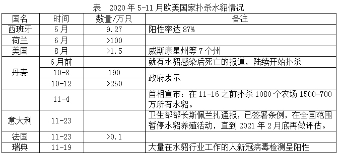 自2020年4月份,西班牙首先報道水貂集中感染新冠病毒和撲殺事件以來,荷蘭等歐美其他國家也陸續(xù)開始報道,同時也報道了水貂感染人,導致人大量發(fā)生新冠病毒的事件。截至2020年11月底,世界衛(wèi)生組織宣布7個國家水貂集中感染事件,并撲殺水貂。歐美國家撲殺水貂情況見表。
